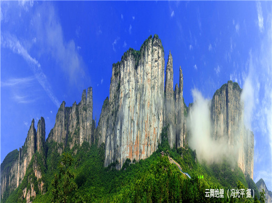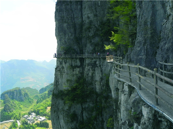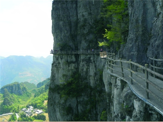 沿着逶迤的山路,我们缓缓前行,在时隐时现的阳光下泛着若有若无的五彩光韵。沿着绝壁栈道体验“北斗七星有七斗,绝壁栈道有七斗,经过一番惊吓后,人生道路手拉手”的真谛,沉迷在武陵风光的绝美中。