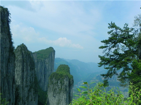 山间阳光普照,忽见远处的绝壁峰丛。话说有绝壁者无峰丛,有峰丛者无绝壁。而在这里兼而有之。不得不说是个奇迹。黄山以“迎客松”而闻名,而在这里我也领略了